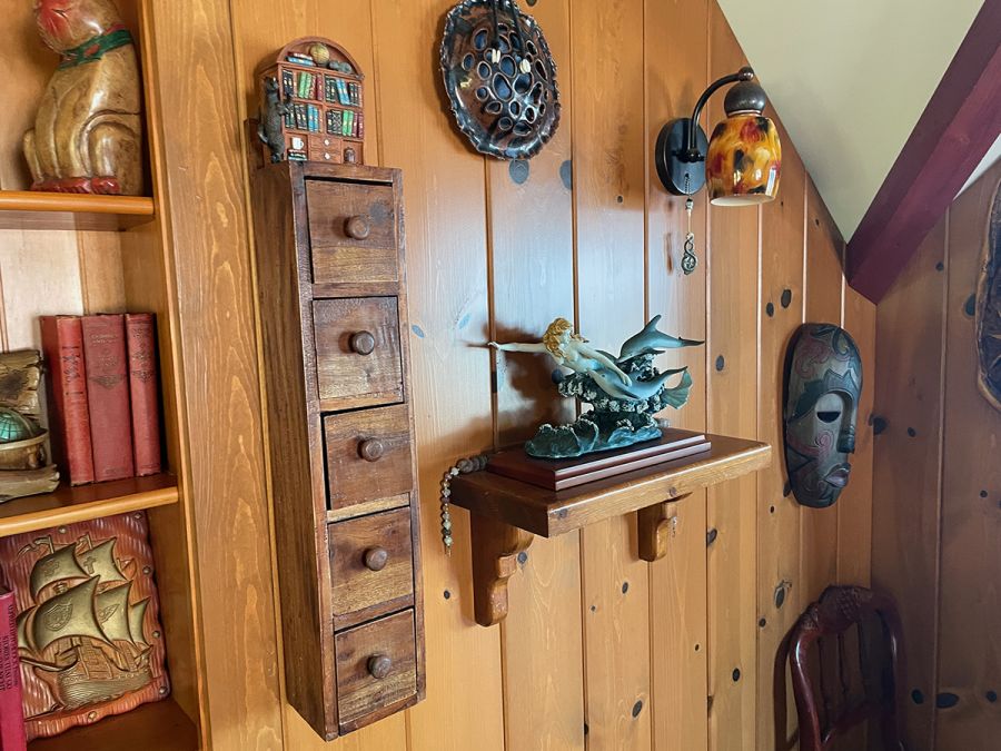 The Carriage House is up one flight of stairs. It is studio space above a 3 car garage. There is a graceful twisted juniper bed (queen sized) in the bed alcove, bathroom with shower (no tub), sun room with booth and table, kitchenette with sink, dishwasher, refrigerator, and microwave. There is no range. Suitable for 1 or 2 people. No smoking or pets.