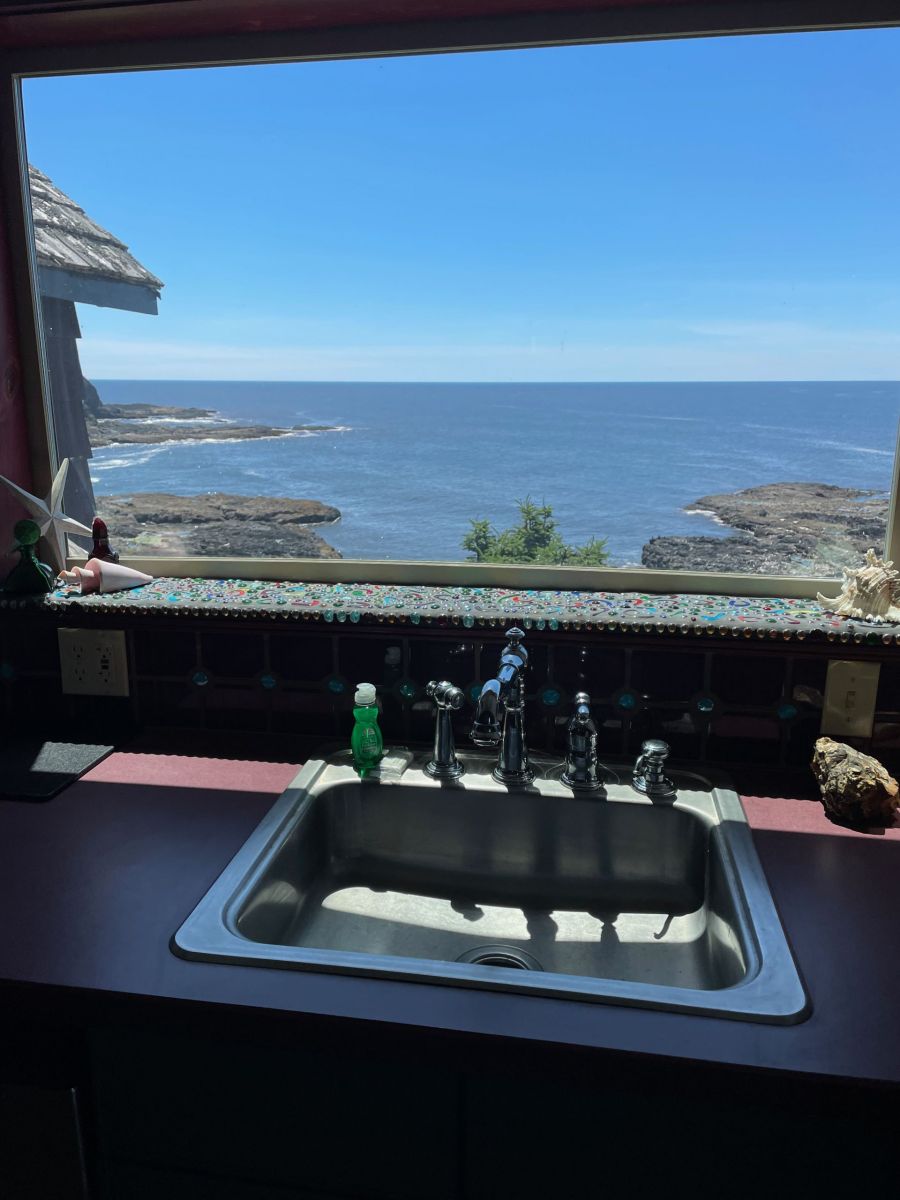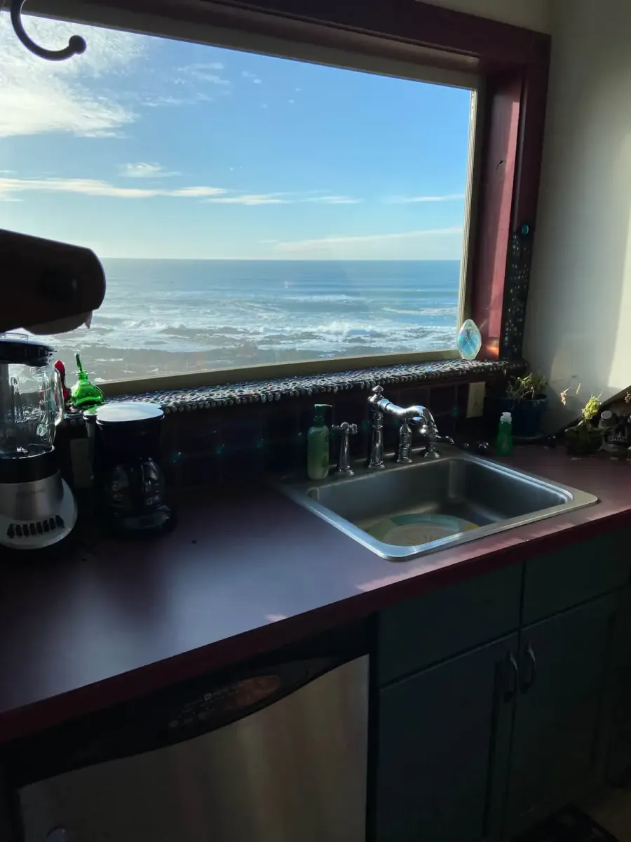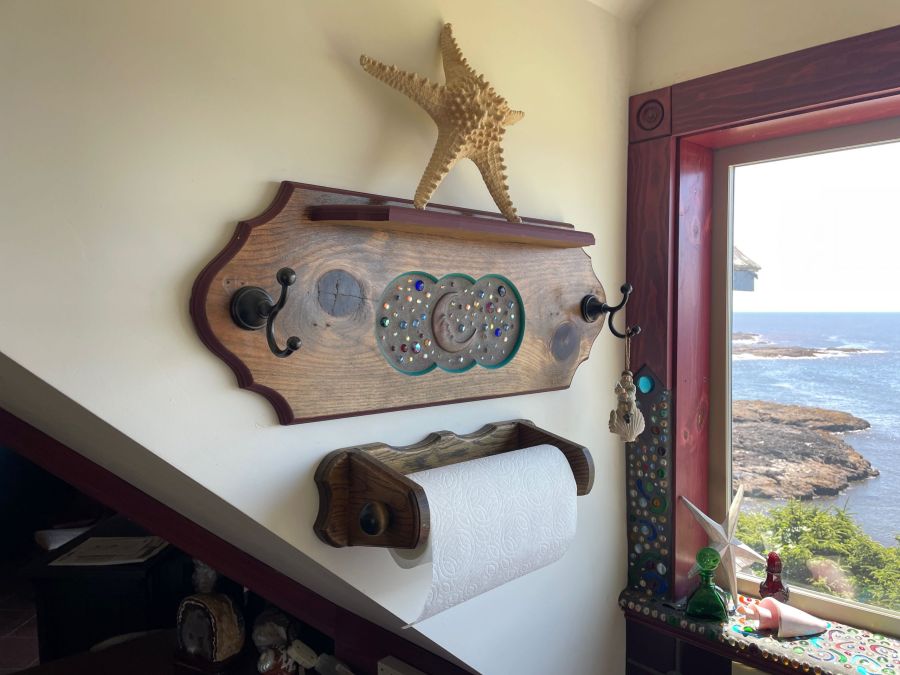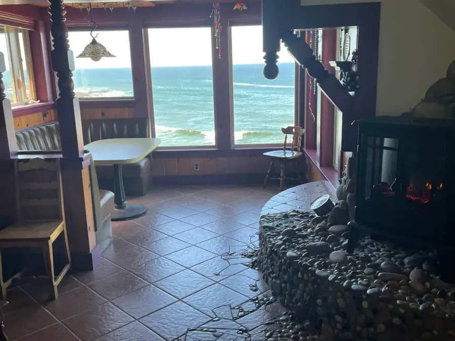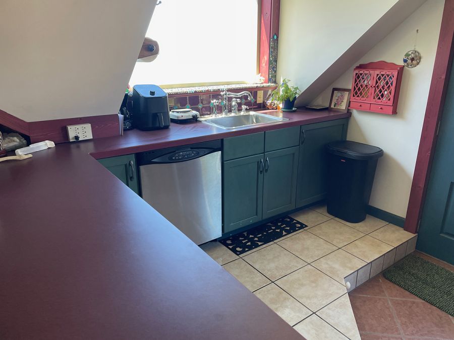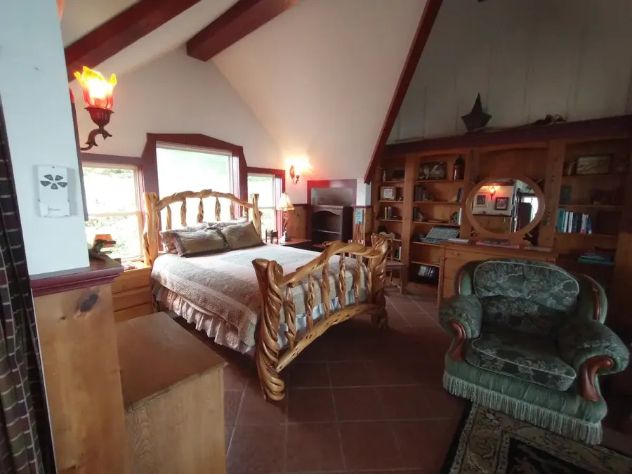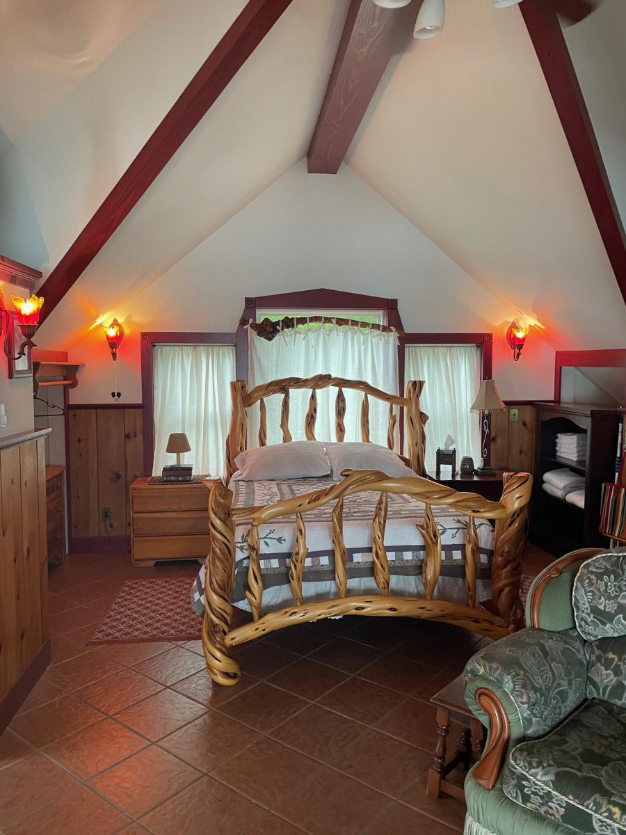 The Carriage House is up one flight of stairs. It is studio space above a 3 car garage. There is a graceful twisted juniper bed (queen sized) in the bed alcove, bathroom with shower (no tub), sun room with booth and table, kitchenette with sink, dishwasher, refrigerator, and microwave. There is no range. Suitable for 1 or 2 people. No smoking or pets.
