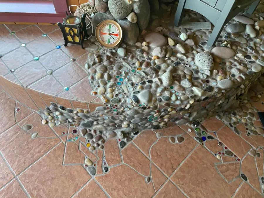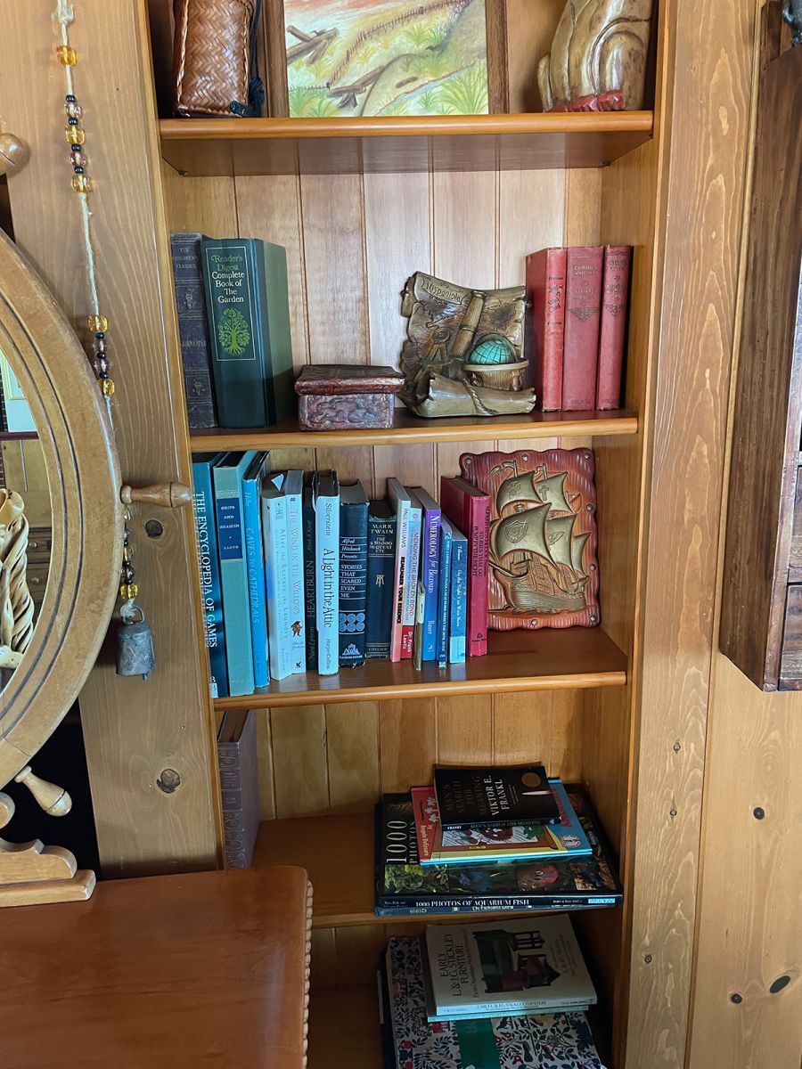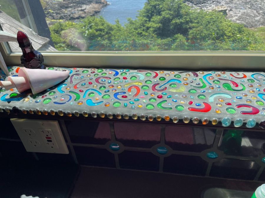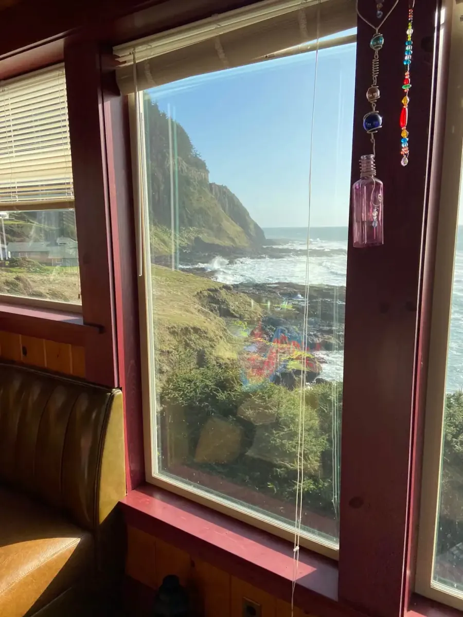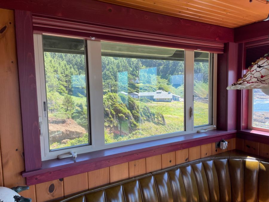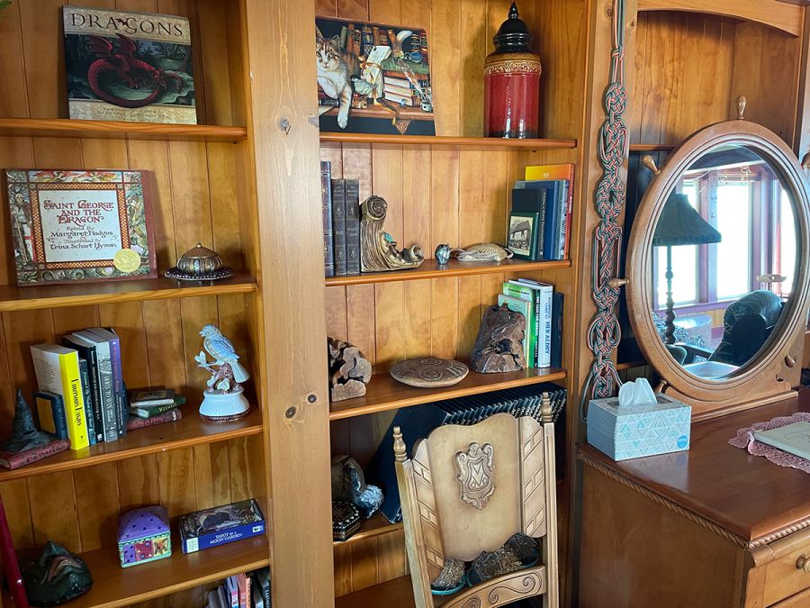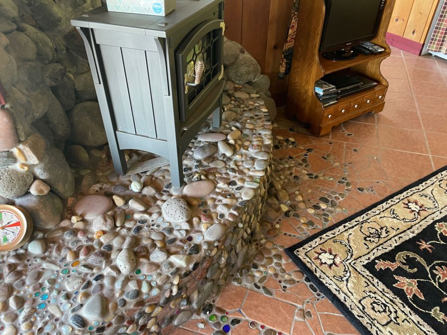 The Carriage House is up one flight of stairs. It is studio space above a 3 car garage. There is a graceful twisted juniper bed (queen sized) in the bed alcove, bathroom with shower (no tub), sun room with booth and table, kitchenette with sink, dishwasher, refrigerator, and microwave. There is no range. Suitable for 1 or 2 people. No smoking or pets.